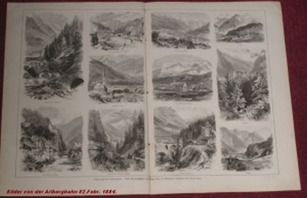 ÖSTERREICH. ARLBERGBAHN. 11 Ansichten auf einem Blatt. Holzstich von Ernst Heyn nach Photographien von Alois Beer. Die Ansichten zeigen u. a. Dalaas, Arlbergtunnel, St. Anton, Flirsch, Langen, Landeck, St. Christoph, Wiesberg. und anderen. Text mit Erläuterungen zur Bau der Arlbergbahn auf der Rückseite des Blattes. Grösse des Blattes: 360 mm x 520 mm. Aus Illustrierte Zeitung Nr. 2119. 2 Februar 1884. Etwas knapprandig. Mittelfalz hinterlegt. -Gerahmt unter Passpartout-