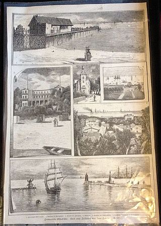 - - - Der Empfang des Prinzen Heinrich von Preussen im Kieler Hafen nach der Rückkehr von seiner zweiten grossen Seereise. Holzstich mit den Schiffen Olga, Blücher, Hansa und das Kaiserboot mit dem Prinzen. Stich nach Zeichnung von Hans Petersen. Blattgrösse: 375 mm x 270 mm. Blatt knapprandig. Der Holzstich entstammt der Illustrierten Zeitung vom 29.03.1884 Nr. 2126. Rückseite bedruckt u. a. mit Text zum Motiv. - Gerahmt unter Glas, unter Passepartout.